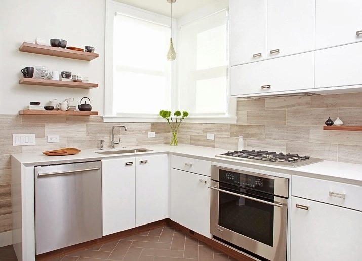 Изненадващо, моделът на печката и пералнята в кухнята също оставя своя отпечатък. Ако височината им съвпада с височината на работната повърхност (вградената плоча, пералнята е „скрита“ под общия плот), това значително ще опрости изчисленията. На практика тази техника е изхвърлена от слушалките: тя се различава по височина, стои отделно. Престилката по стените помага за „сглобяване“ на сложна композиция и обединяване на пространството, а височината й трябва да е на нивото на най -ниския обект (най -често това е плоча). В този случай престилката е леко “спусната” с няколко сантиметра (правят се надбавки), така че стената да не изглежда зад плочата.
