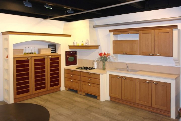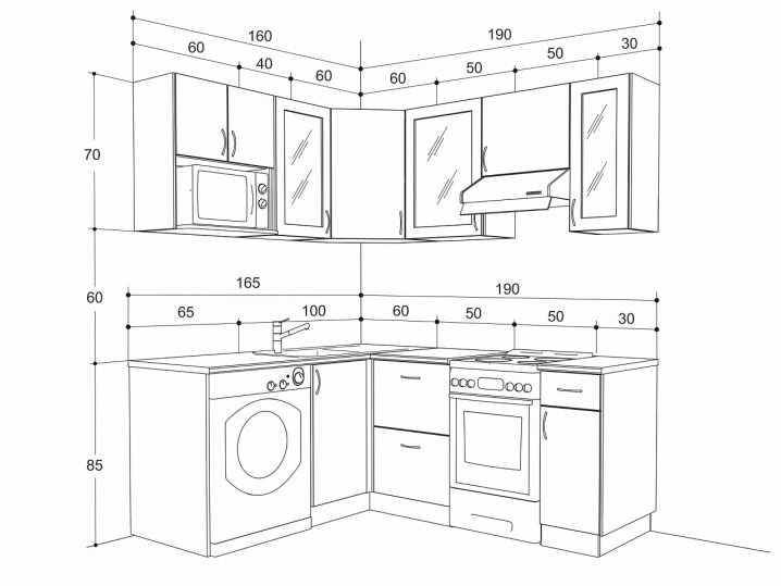 Големите домакински уреди не се поставят в шарнирните шкафове за кухненската стая, така че ширината им може да варира: 15, 30, 45, 50, 60 и 80 см, дълбочина – 37 см.