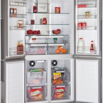 От гледна точка на съхранението на храни битовите хладилни шкафове се считат за най -удобни.. Те се отличават със специална конфигурация: повече от две отделни отделения за съхранение: фризерно отделение, отделение за съхранение на месо, плодове и билки, други отделения със специални функции. Това положение на отделенията значително повишава нивото на безопасност на храните, тъй като всеки вид храна се съхранява зад собствената си врата, което води до намаляване на броя на отворите на вратите, а това е благоприятно за поддържане на вътрешната температура и микроклимата. Тези модели често са оборудвани с най -новите функции, като отделение за съхранение във вакуум или специални филтри, които поддържат въздуха свеж..
