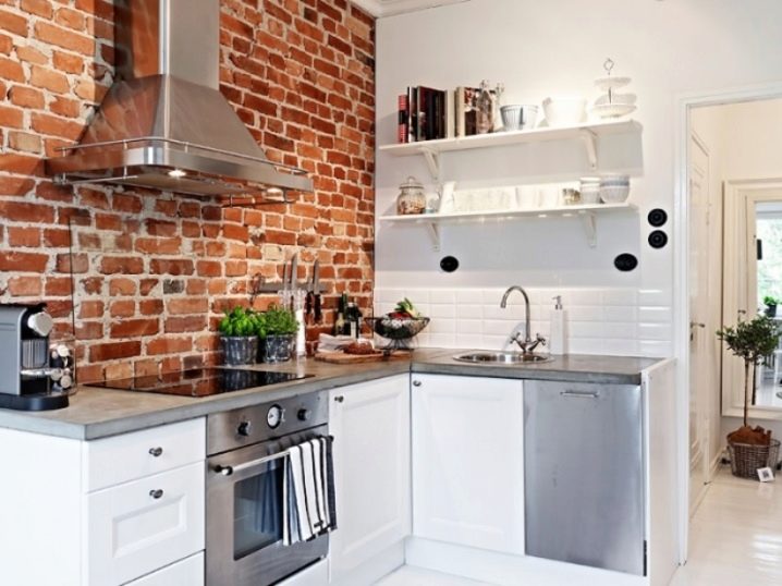 Тухла. Прекрасен оригинален материал за декориране на вашето кухненско пространство. Такива стени дори не изискват допълнителна декорация. Важно е само да изберете цвета на тухлата за основната цветова схема на кухнята;