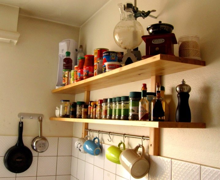 Декоративни рафтове. Това са не само красиви, но и много функционални интериорни елементи. Можете да поставите върху тях красиви ястия, ярки буркани с подправки; закачете държачи за кърпи и кърпи на куките. Можете също така да ги украсите със сувенири и дори саксийни цветя;