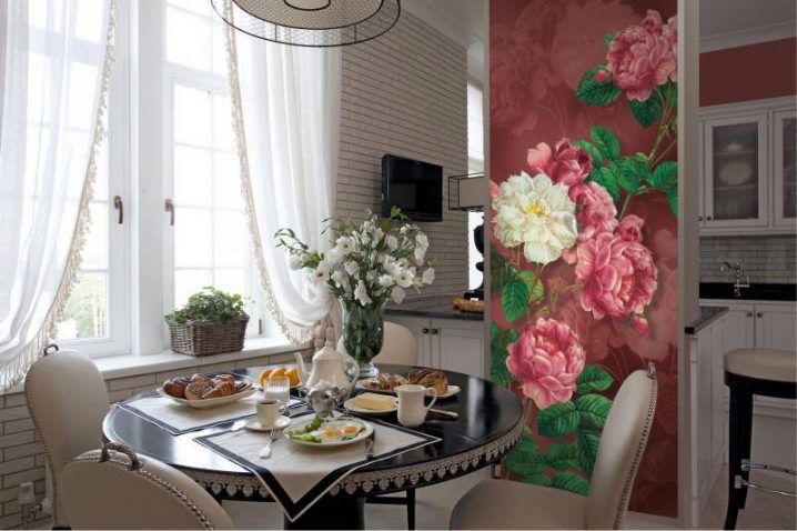 Украса за фототапети. Тук, къде, къде и на свободна стена в зоната за хранене фототапетът ще изглежда много хармонично и успешно. Важно е да изберете картина, подходяща по значение и цвят за вашето кухненско пространство. Селските мотиви, гледките към града, природата изглеждат много красиви. Не забравяйте, че избраната рисунка трябва не само да се хареса и да се впише в интериора, но и да възбуди апетита ви;