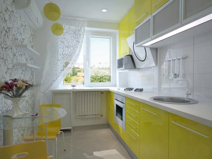 По въпроса за декорацията на стени в кухнята в “Хрушчов” е важно да вземете избора на цвят с цялата сериозност. Добре е, ако това са светли, неутрални нюанси: сиво-синьо, бежово, бяло, светло зелено, лимон. Пространството трябва да бъде организирано колкото е възможно повече. Не претоварвайте кухнята с детайли, ненужни интериорни предмети. Ако е възможно, скрийте малки уреди в ниши или шкафове..