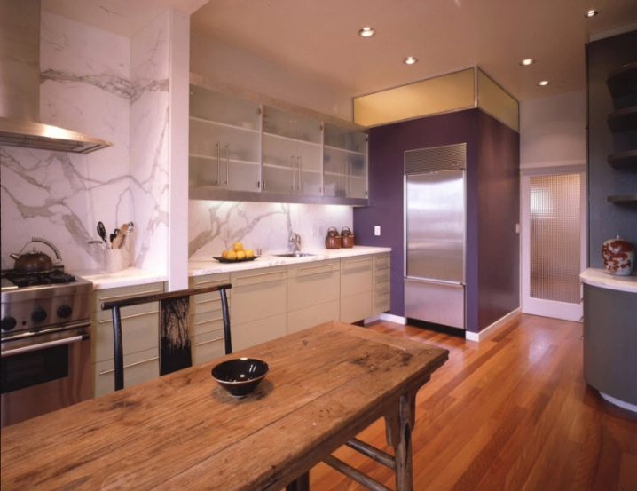 Кафяв паркет, дървена маса с текстура, бяла работна зона в стила на минимализма, мраморни плочи, които украсяват стената в зоната за готвене, ще внесат лукс и комфорт в кухнята.