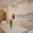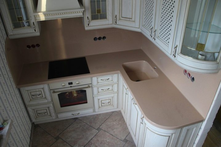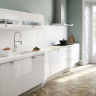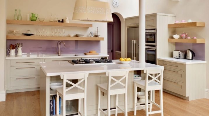 Ако не харесвате яркостта и предпочитате по -спокойни цветове, тогава кухнята може да бъде декорирана в неутрални цветове. Например, за класическа кухня е подходящ лек кухненски комплект с бял плот и светло люлякова стъклена престилка..