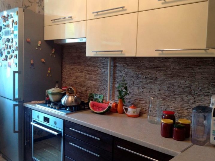 - Фалшив диамант. Този естествен материал е скъп и натоварва огромно структурата на сградата. Ето защо, за декориране на стените на кухнята, е по -добре да използвате стенни панели, които имитират изкуствен камък..