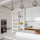 - Стелаж – тяхната дължина обикновено е 2,5 м и ширина 30 см. Ако кухнята има много ъгли или малко място, тогава светлинните стелажи визуално ще увеличат стаята. Ако се постави хоризонтално, кухнята ще изглежда по -продълговата. И ако е вертикален, таванът ще изглежда по -висок. Панелните стелажи изобщо не са трудни за монтиране: с помощта на скоби или самонарезни винтове те са прикрепени към щайгата.