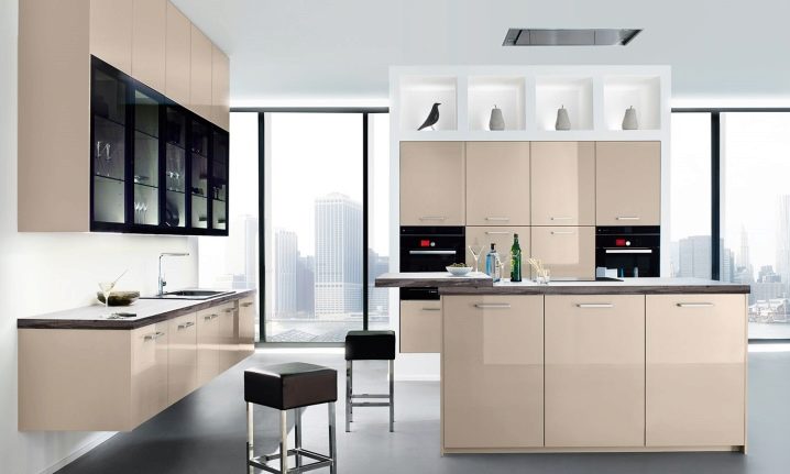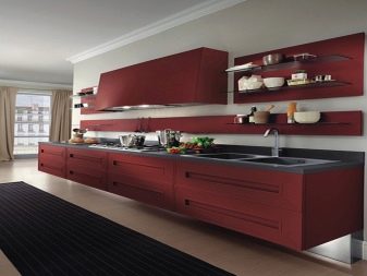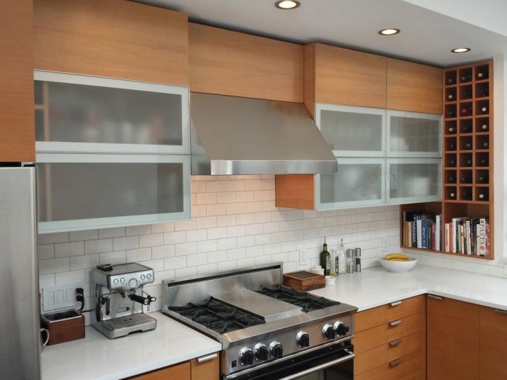 В съвременните интериорни решения за зони за готвене, стенните шкафове често се монтират веднага заедно с аспиратора. Тяхната конфигурация предвижда използването на затворени, отворени или комбинирани фасади. Най -популярните модели са с удобни врати на панти или шарнири. Тези абсорбатори, претеглени от аспиратора, трябва да бъдат прикрепени към стената толкова сигурно, колкото тези, оборудвани с дренаж за съдове..