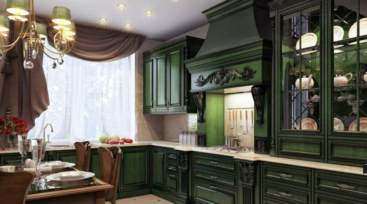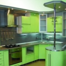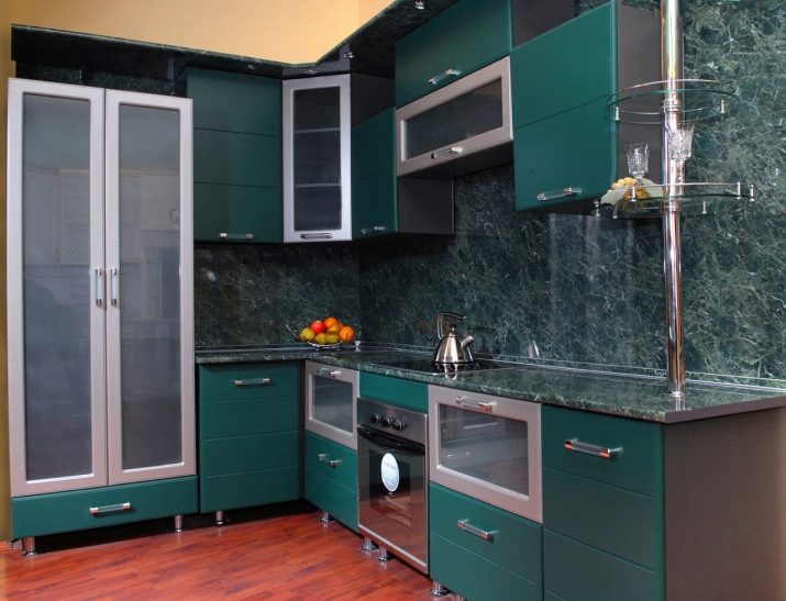 Отличителна черта на стенните ъглови шкафове за кухнята е тяхното необичайно и много просторно „пълнене“ под формата на дълбоки триъгълни рафтове, разтегателни системи или рафтове, които се въртят около оста си, което осигурява свободен достъп до хранителни запаси и кухня съхранявани там прибори.