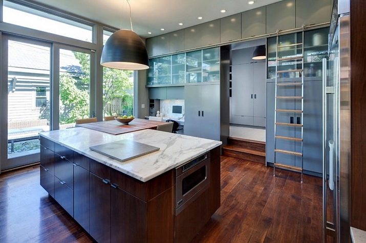 - Висящи шкафове до тавана сега са много популярни сред опитни дизайнери и почитатели на минимализма. Струва си да отдадем почит на интересния интериорен дизайн и атрактивната хармония на такива структури. Кухня с високи шкафове от стена до таван е най-добрият избор за тези, които се нуждаят от много място за съхранение на всичко, от което може да се нуждаят по време на процеса на готвене. Въпреки това, как точно трябва да вземете това, което ви трябва от горните рафтове, все пак е по -добре да помислите предварително и незабавно да осигурите това със специална мобилна компактна стълба.