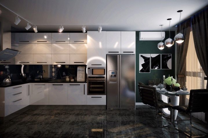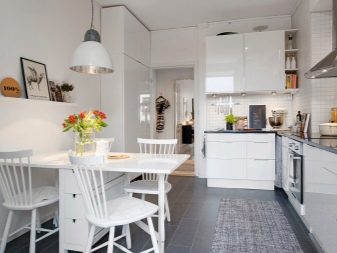 Най -изгодната от всички висяща кухня с долни шкафове, плаващи над пода, ще изглежда в просторна стая, защото тази красота може да бъде оценена адекватно само от разстояние. Но безспорните предимства от почистването под окачените долни шкафове на такава кухненска зона и удобното положение на краката по време на готвене веднага ще получат универсално признание..