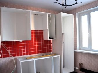 Ако първо съберете и окачите всички кутии без врати на стената, тогава ще бъде по -лесно да окачите фасадите и да регулирате пантите по -късно.. В допълнение, такъв монтаж и монтаж ще даде възможност да се контролират пролуките между шкафовете и ако все пак направите грешка в изчисленията, тогава е много по -лесно да премахнете шкаф без фасада, отколкото напълно сглобен..