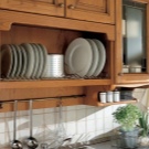 - В стенен кухненски шкаф със слепи врати лесно се вгражда многостепенна сушилна структура, в която се поставят няколко комплекта кухненско оборудване наведнъж. И ако премахнете дъното на такъв шкаф, висящ директно над мивката, тогава водата от измитите съдове ще се оттича директно в мивката. А това означава, че вече не е необходимо допълнително да го оборудвате с вентилационни отвори и палет, който предпазва кухненските мебели от нежелана влага. Но полезно допълнение към такъв окачен шкаф ще бъде малко отделение, където ще бъдат поставени препарати, гъби и салфетки от микрофибър..