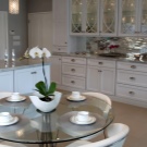 Ние украсяваме стилни стъклени плотове с нежни материи, украсяваме с красиви вази със свежи цветя. На повърхността на масата дизайнерите съветват да се поставят ръчно изработени покривки. Те трябва да са с изключителен дизайн и да подчертават конфигурацията на масата. Друга модна тенденция е акрилната кухня. Красивите акрилни слушалки, плотове, панели изглеждат модерни, стилни и лесни за грижи. Ние сглобяваме интериора на стилна кухня самостоятелно, ако бюджетът е ограничен и искате да внесете нотка на индивидуалност в кухнята.