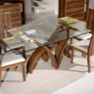 Дизайнерите препоръчват да изберете модели, които комбинират два или повече материала. Стъклото и естественото дърво са благородна и скъпа комбинация. Рядък вид дърво от венге хармонично се комбинира със стъклен плот. Маса с дървени крака и стъклена повърхност – безтегловност, която идеално се вписва в минималистичен интериор.