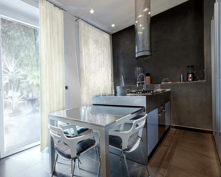 - Масите, изработени от този материал, са визуално по -малко обемисти от дървените плотове. В малка кухня те изглеждат хармонично и безтегловност..