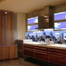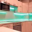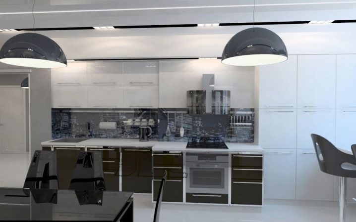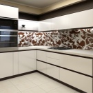 Вариации на “високотехнологичния” стил предполагат възможността за присъствие на градски пейзажи, подводния свят, плажове, билки и цветя в дизайна на кухненското пространство. Изглежда особено впечатляващо, когато има подсветка по долния ръб на стенните шкафове..