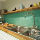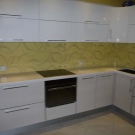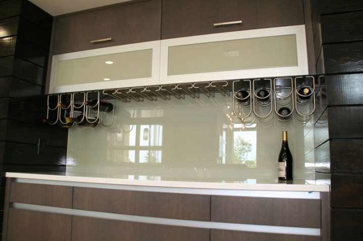 Една от актуалните тенденции в дизайна на кухнята е използването на стъкло вместо традиционни плочки. Благодарение на гладката си и непорьозна повърхност, гръбът е по-устойчив на влага и плесен. В допълнение, способността му да отразява светлината визуално увеличава размера на стаята и придава допълнителна яркост дори на тъмна кухня..