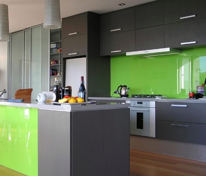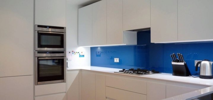 Има опции за едноцветен дизайн на кухненска престилка със стъкло. В този случай се използват такива модификации като: