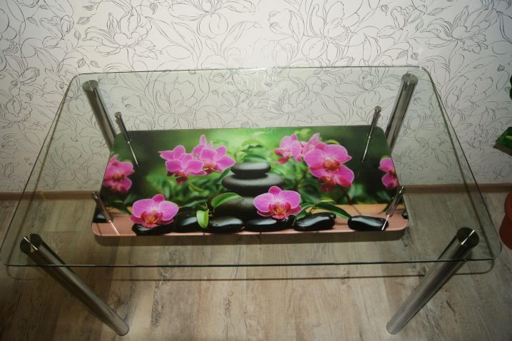 Стъклото ще бъде отлично решение да украсите кухнята си с високо качество, използвайки фотографско изображение. За Прованс, винтидж, шаби шик стилове можете да изберете флорални апликации, снимки на скъпоценни бижута, селски мотиви. Цялата композиция ще бъде украсена с дървена подрамка и изискани ковани крака.