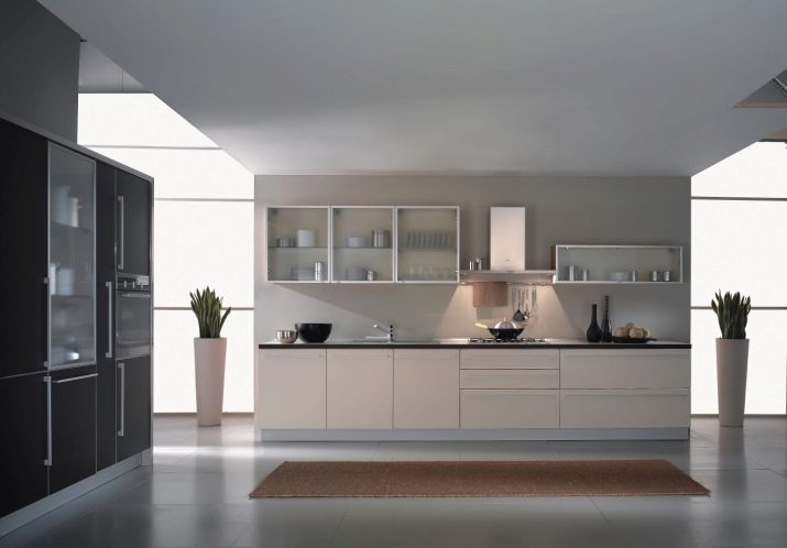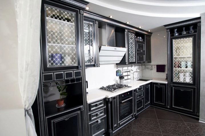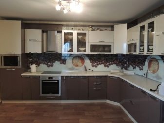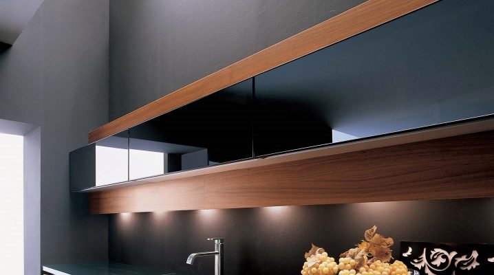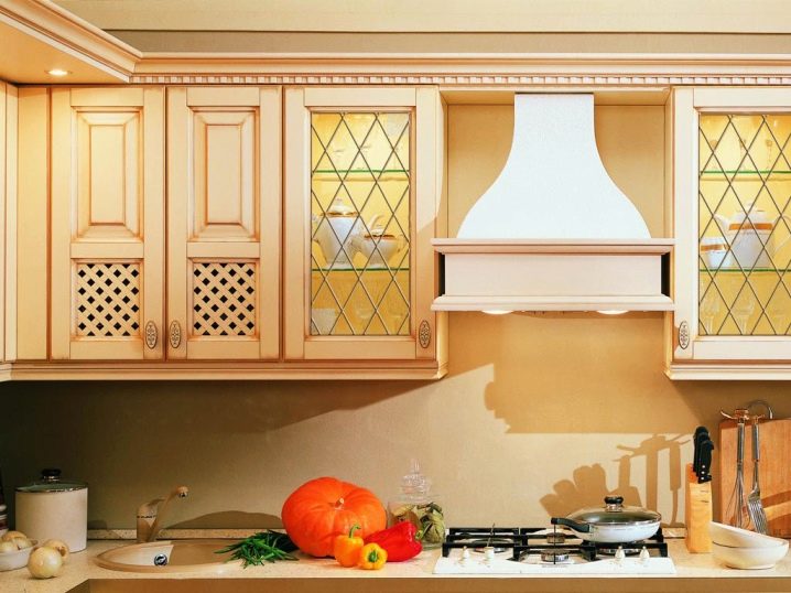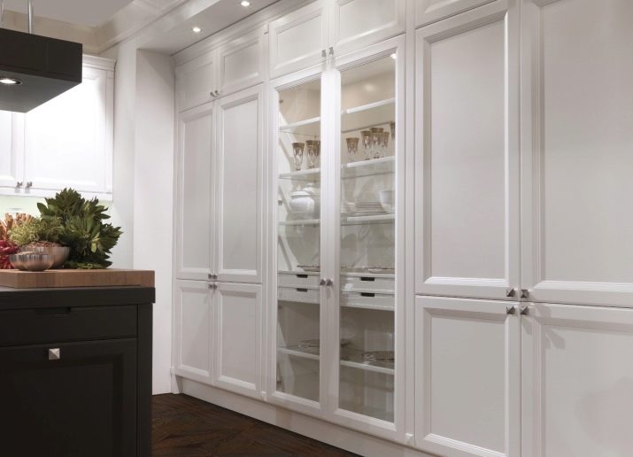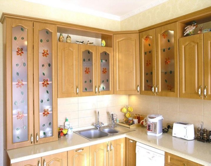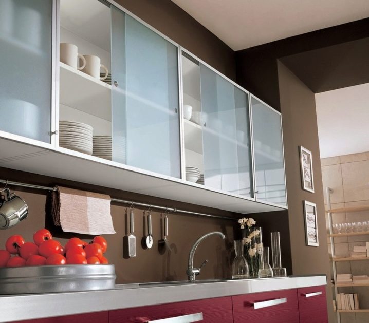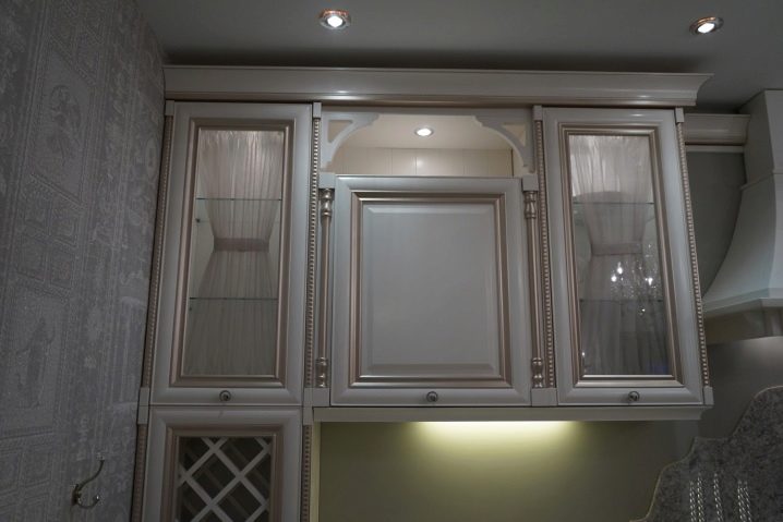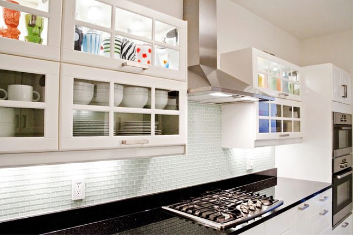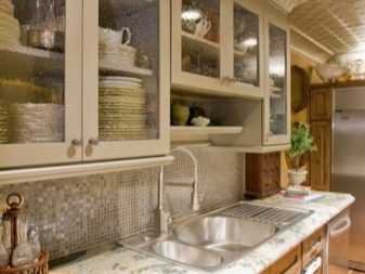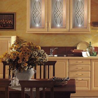 Комплект със стъклени фасади ще помогне да се добави специална изтънченост към интериора. Това е отличен заместител на затворени кухненски шкафове, докато прахът не прониква в шкафовете, но ясно се виждат съдове и декоративни предмети, които сега се предлагат в много.