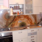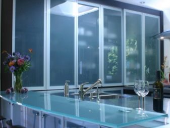 За модерна кухня такова стъкло е идеално. Той подчертава играта на различни цветове и нюанси..
