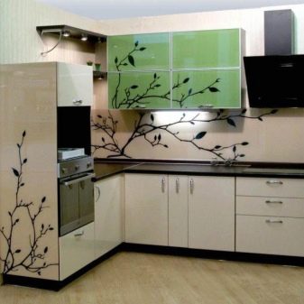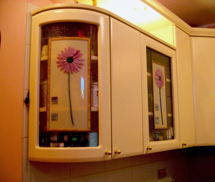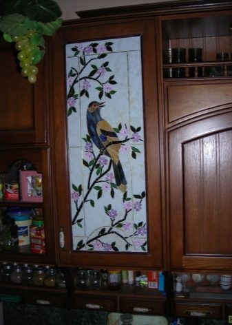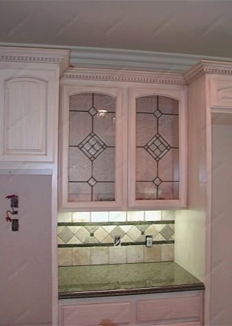 За кухненския шкаф се използва витражи или цветен филм, с помощта на който се създава всеки модел. Мебелите изглеждат по -интересни в тази форма, отколкото със стандартното прозрачно стъкло. Можете да изберете цвят за всеки вкус.