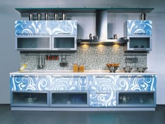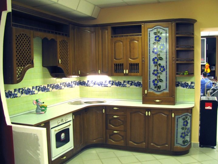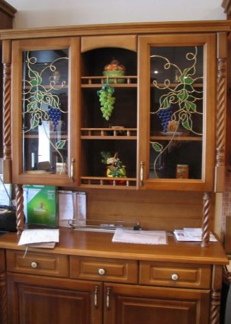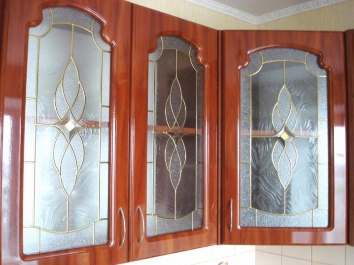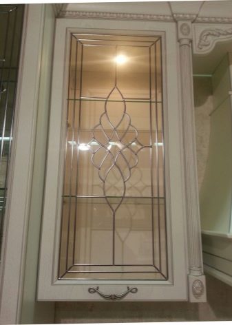 Един от много скъпите продукти е извитото стъкло с декорация и пръскане. Кухненските шкафове с витражи също ще бъдат скъпи, когато фасадата се състои от парчета с различен цвят..