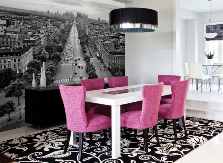 Друго интересно дизайнерско решение за черно -бяла кухня са стенописите. За тях най -добре е да подчертаете стената, близо до която се намира масата за хранене. Но мебелите трябва да са на разстояние, за да не нарушават панорамната гледка. Това може да бъде изглед от птичи поглед към небостъргачи, различни скици на градския живот, футуристични гледки.