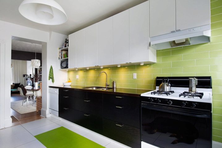 За кухненски комплект можете да направите ясно разграничение между черно и бяло. Закачете бели шкафове и качулка на стената, поставете черни на пода; плотът с печката също ще бъде в тъмен цвят. Стените могат да бъдат подчертани. Структурираните тапети, направени да изглеждат като плочки или тухли, ще са подходящи. Нежният зелен цвят на тревата ще добави свежест към интериора.