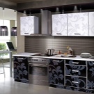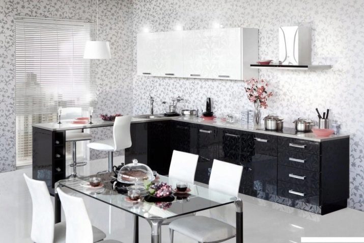 Черен или бял тапет изглежда хармонично с малък модел, дребен шрифт. Това могат да бъдат геометрични фигури, различни надписи. В такава кухня можете спокойно да използвате цветни акценти. Със слушалки, с плот можете да експериментирате. Черен тапет с бял резбован модел ще изглежда много модерен и стилен с червени шкафове; плотът в този случай трябва да е в черно.