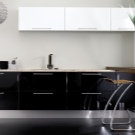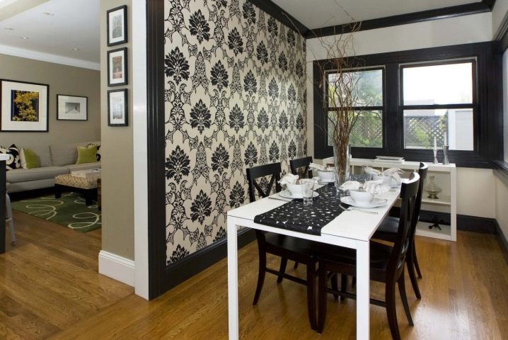 Кухнята в черно и бяло ви позволява да експериментирате с декорация на стени. Можете да използвате мазилка, тапети с щампи и шарки. Оригинално решение ще бъде обикновен тапет. Направете един ъгъл и две стени бели, останалите черни.