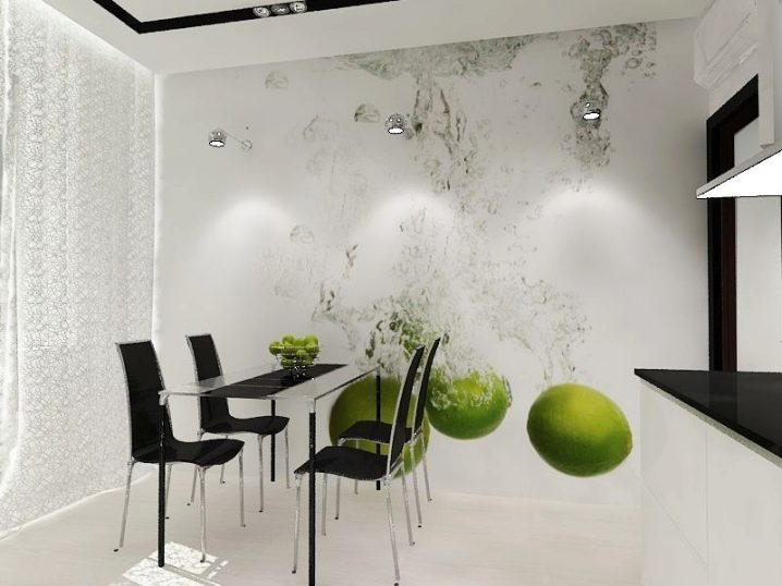 Тапетите не трябва да са черно -бели. Те могат да внесат оживление в интериора, цвят и вкус. Яркозелените сочни лаймчета, потопени в бистра вода, ще изглеждат оригинални на бял фон. В този случай доминиращият цвят в кухнята трябва да бъде бял. Черно може да се приложи върху плотове, столове.
