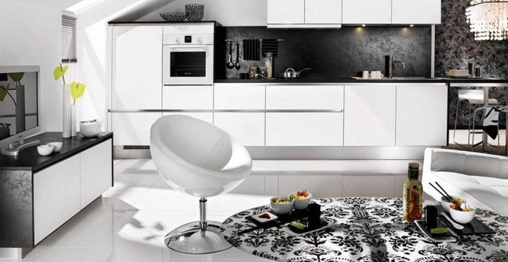 Необичайният ефект от такъв интериор се постига благодарение на контраста на цветовете, които се допълват едновременно. Тапетите за черно -бяла кухня ще ви помогнат да се съсредоточите върху определен цвят и да увеличите пространството. Ярко оцветен текстил, червени или оранжеви съдове, лилава ваза или син чайник успешно ще се впишат в такъв интериор. Златният детайл ще добави лукс. Металният цвят ще направи черно -белите кухни по -модерни.