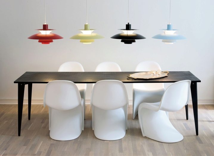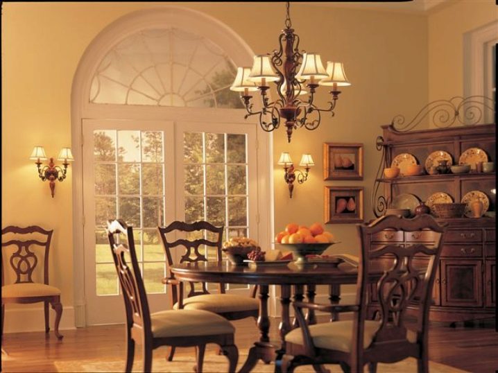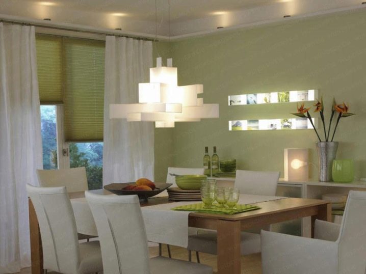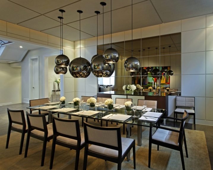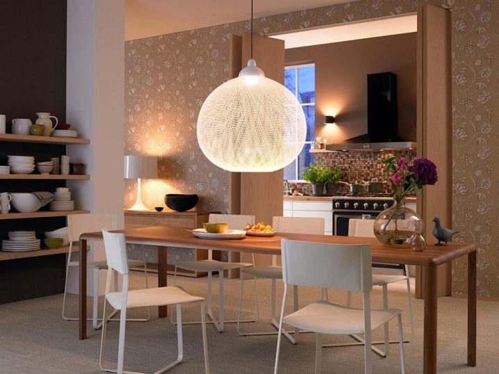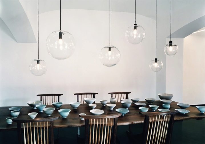 Най -ефективното разположение на такива сенници е 1,5 м от лампата до масата. Можете да окачите един голям плафон, но е позволено да поставите няколко по цялата маса.