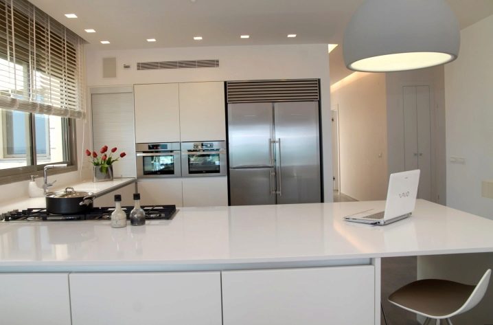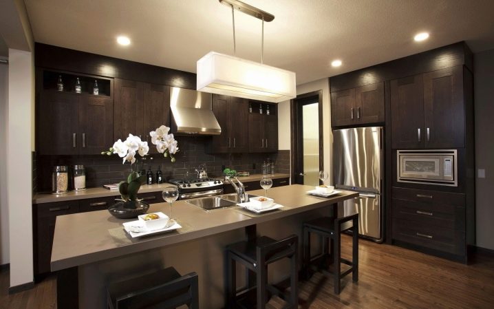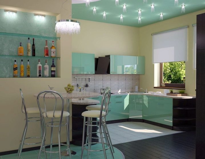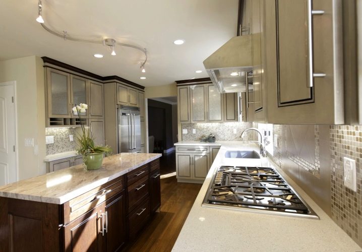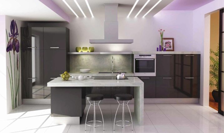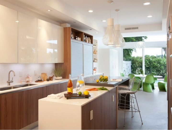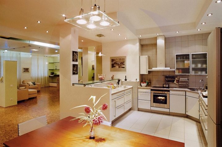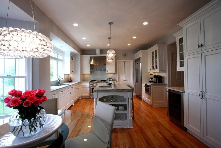 Този тип лампи са идеални, ако вашата кухня има окачени или окачени тавани. В повечето случаи те се използват като прожектори. Но има опции за дизайн, когато се използват прожектори за осветяване на цялата кухня като цяло. Това се използва особено често в малка кухня..