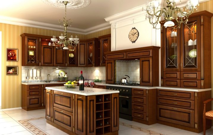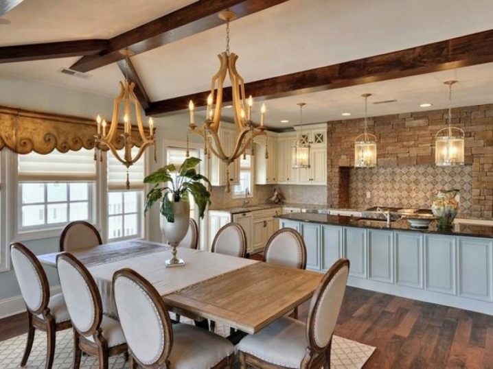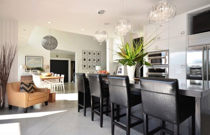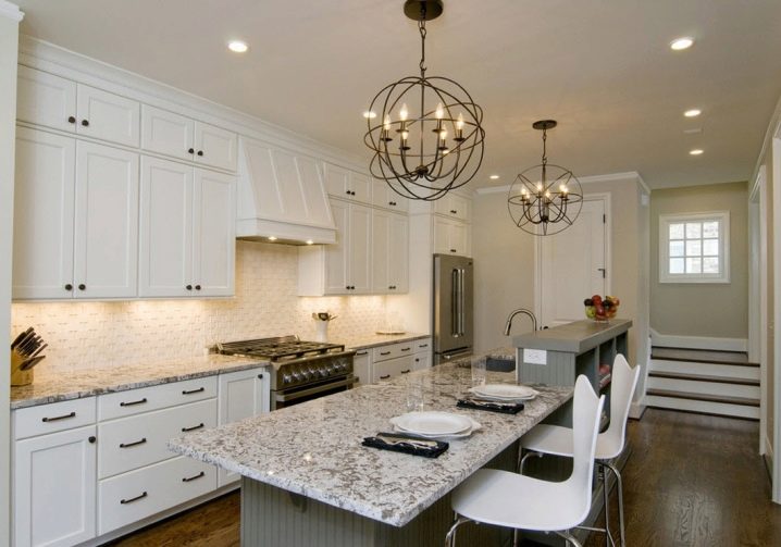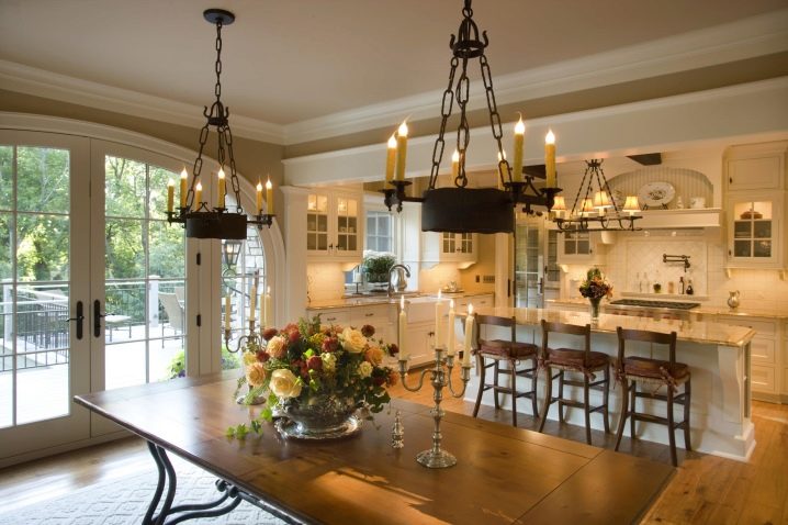 В съвременния кухненски интериор вече не се използва толкова широко, колкото преди. Но в класическия интериор тя все още има място. Също така не можете без него в големи кухни, където за масата за хранене е отделена отделна зона, която се нуждае от отделна светлина. Мнозина ще кажат, че полилейът е неудобен, той скрива пространството, но това не е съвсем вярно. Съвременните дизайнери разработват различни форми на полилеи. Това са не само висящи над главата ви плафони, които не са много подходящи за малки кухни, но и различни лампи, опънати по хоризонталната равнина, които няма да ви пречат. Полилеят, разбира се, няма да може да осветява всички далечни ъгли, но може да се комбинира с локално осветление.