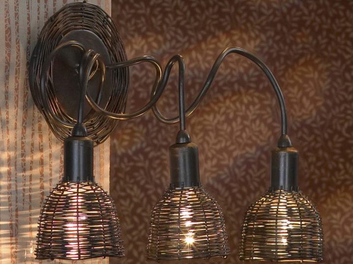 - Абажур от медна тел, напомнящ на плетена кошница върху лампа над главата в работната зона, е идеална за декориране на селски таван.