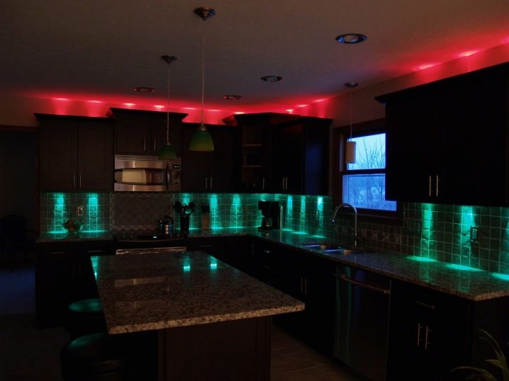 - LED. Този изглед е лента с много светодиоди, които също могат да бъдат монтирани на тавана, за да осветят работната зона или да подчертаят различни нива на тавана. Те блестят ярко, консумират минимално количество електроенергия, но не са евтини.