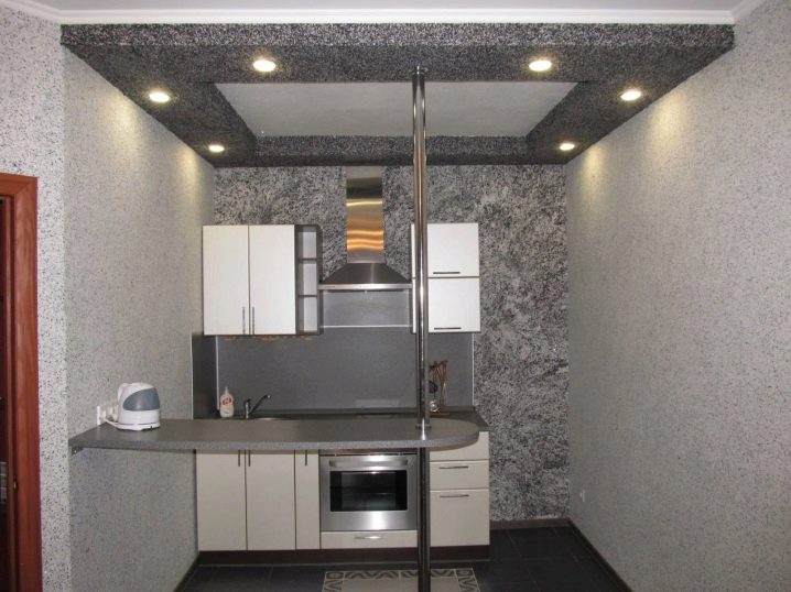 Течният тапет е подобен на текстилни аналози или декоративна мазилка. Когато започвате ремонт, обърнете внимание на този продукт. Такива тапети не се страхуват от продължително излагане на високи температури, това е толкова важно за работната зона. Текстурата на тапета дава гаранция за издръжливост, те не са склонни към механични повреди.