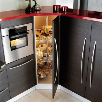 За малките стаи трябва да помислите за закупуване на трапецовиден ъглов шкаф, което ще направи възможно по -доброто организиране на пространството.. Той е по -просторен, често оборудван с въртящи се рафтове, въртящи се механизми, което ви позволява лесно да достигнете до всеки предмет.