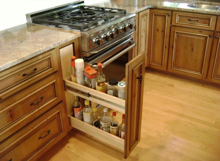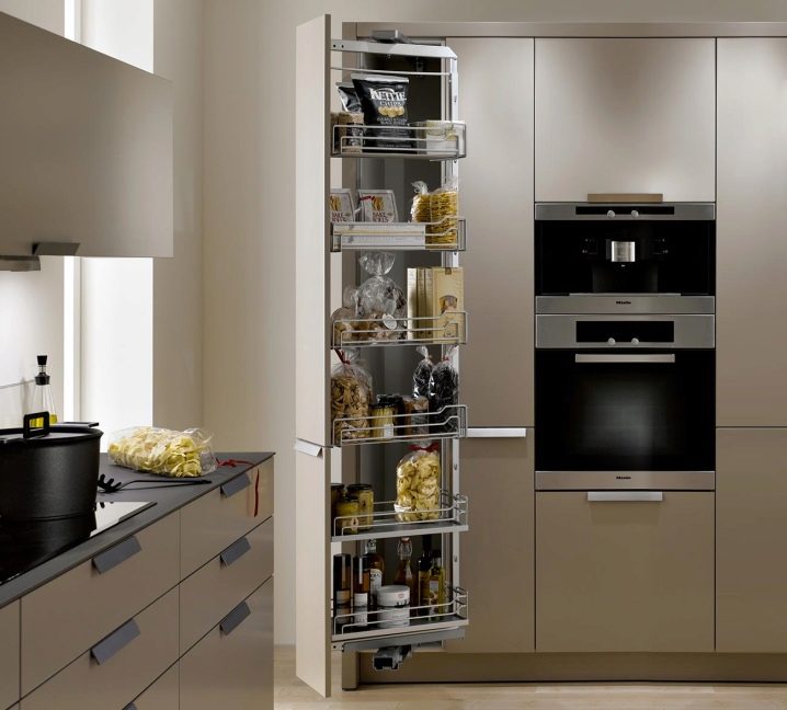 Понякога е трудно да поставите голям брой тесни високи бутилки и буркани с храна (олио, оцет, подправки), така че да са под ръка и да не пречат на останалото време. В този случай изваждащият се шкаф за бутилки ще ви помогне. Ширината 15 или 20 см ви позволява да го монтирате на места, където другият не може да се побере.