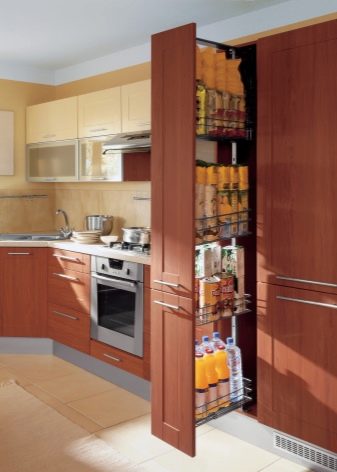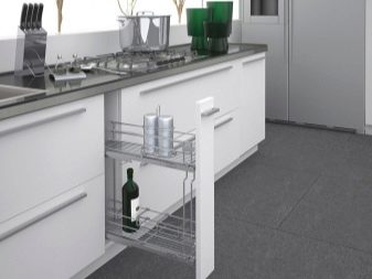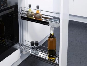 Понякога е трудно да поставите голям брой тесни високи бутилки и буркани с храна (олио, оцет, подправки), така че да са под ръка и да не пречат на останалото време. В този случай изваждащият се шкаф за бутилки ще ви помогне. Ширината 15 или 20 см ви позволява да го монтирате на места, където другият не може да се побере.