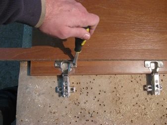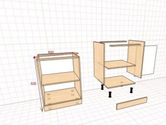 По -добре е да монтирате вратата заедно.. Първо пантите са прикрепени към вратата, след това вратата е прикрепена към шкафа и дупките за пантите са маркирани на страничната повърхност. Дръжката е фиксирана на всяка удобна за домакинята височина. Задната стена е закована с ботуши.