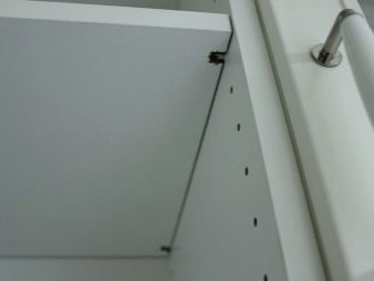На рафтовете са направени дупки, така че да се подравняват с отворите отстрани на шкафа. Прикрепете рафтовете към страничните стени. Първо от едната страна, после от другата. След това се пробиват дупки и фасадата се прикрепва към страничните стени.
