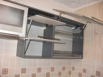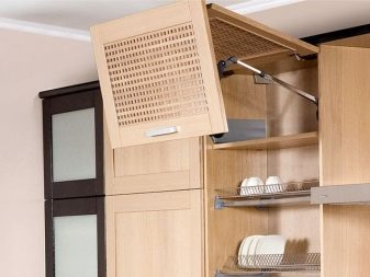 - Стенен шкаф. За малка кухня е по -добре да изберете стенен шкаф със стъклени врати или с врати на повдигащи механизми. Вдигащите се врати са особено удобни за дълги, ниски шкафове, които се поставят над печката или над мивката..
