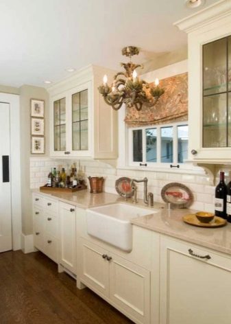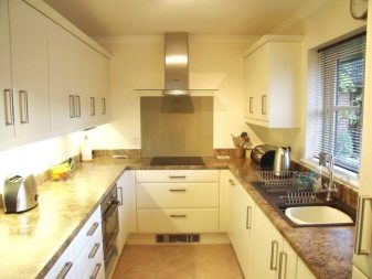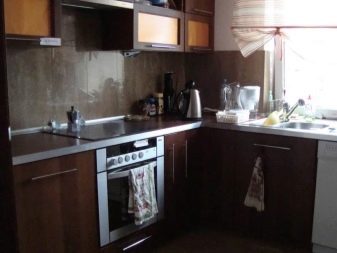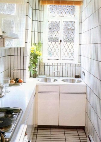 Най -доброто решение за малка кухня се счита за ъглов комплект, който заема две съседни стени.. Това оформление е много удобно за самата домакиня и спестява свободно място за трапезарията. Друг плюс е, че ъгловият стенен шкаф е много просторен по обем и е идеален за съхранение на съдове..