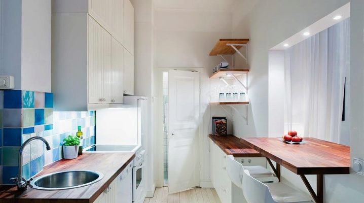 Разтегателна сгъваема маса, „скрита“ в горната част на шкафа или между шкафовете, ще помогне значително за спестяване на място.