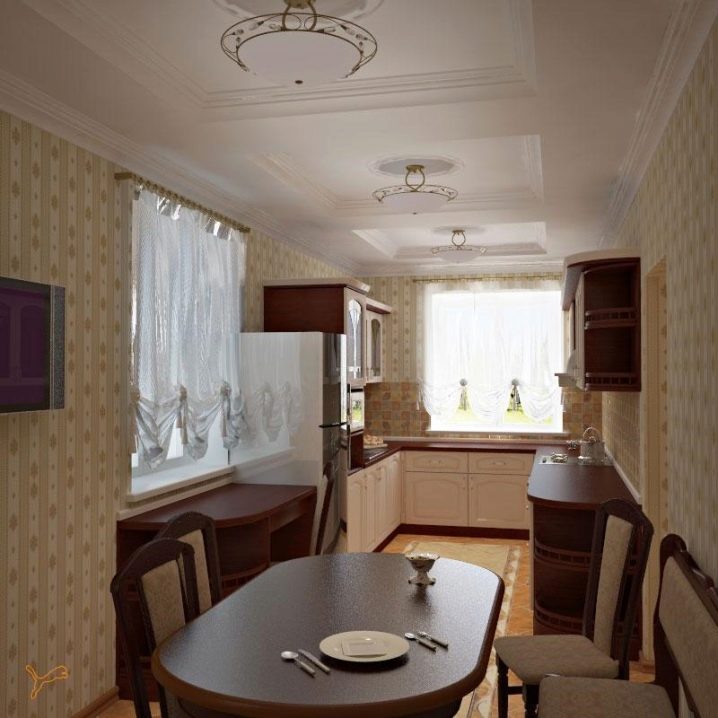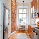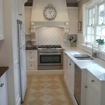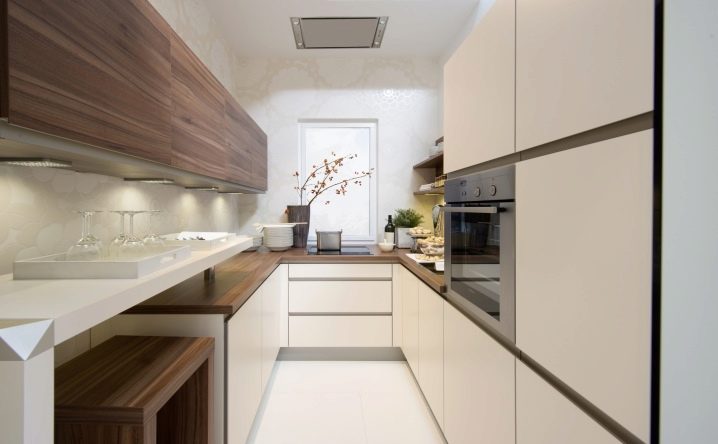 Ако ширината на кухнята позволява, тогава дизайнерите съветват да подредите мебели от двете страни на нея – интериорът ще изглежда по -хармонично с равномерно разпределение на мебелите и ще имате доста голяма работна площ.