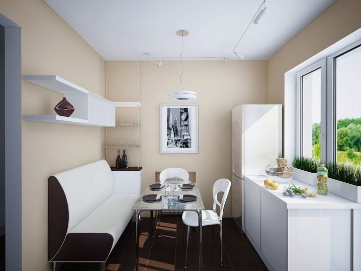 Може да има малка кухня с диван. В този случай обърнете внимание на леки дивани или ъглови дивани със сгъваеми седалки. Под седалките може да се монтира кутия за съхранение на кухненски прибори. По този начин ще получите удобна функционална мебел. Можете също да инсталирате диван на границата на зоните, като по този начин разделите хола и кухнята..